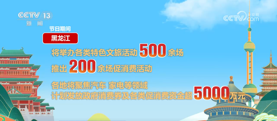 节日期间,黑龙江将举办各类特色文旅活动500余场,推出200余场促消费活动。各地将聚焦汽车、家电等领域,计划发放政府消费券及各类促消费资金超5000万元。