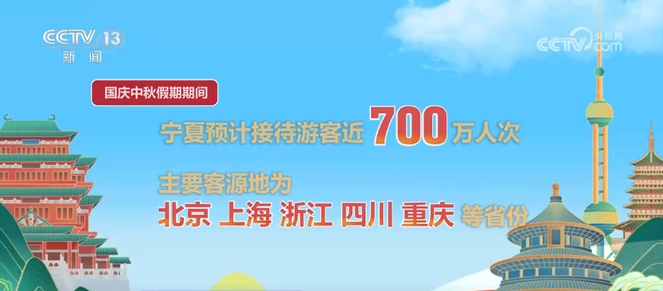 记者从宁夏文化和旅游厅获悉,作为西北地区的重要旅游目的地,国庆中秋假期期间,宁夏预计接待游客近700万人次,主要客源地为北京、上海、浙江、四川、重庆等省份。其中,宁夏5A级景区中的中卫沙坡头、沙湖生态旅游区以及今年申遗成功的西夏陵国家考古遗址公园预计游客接待量较大。